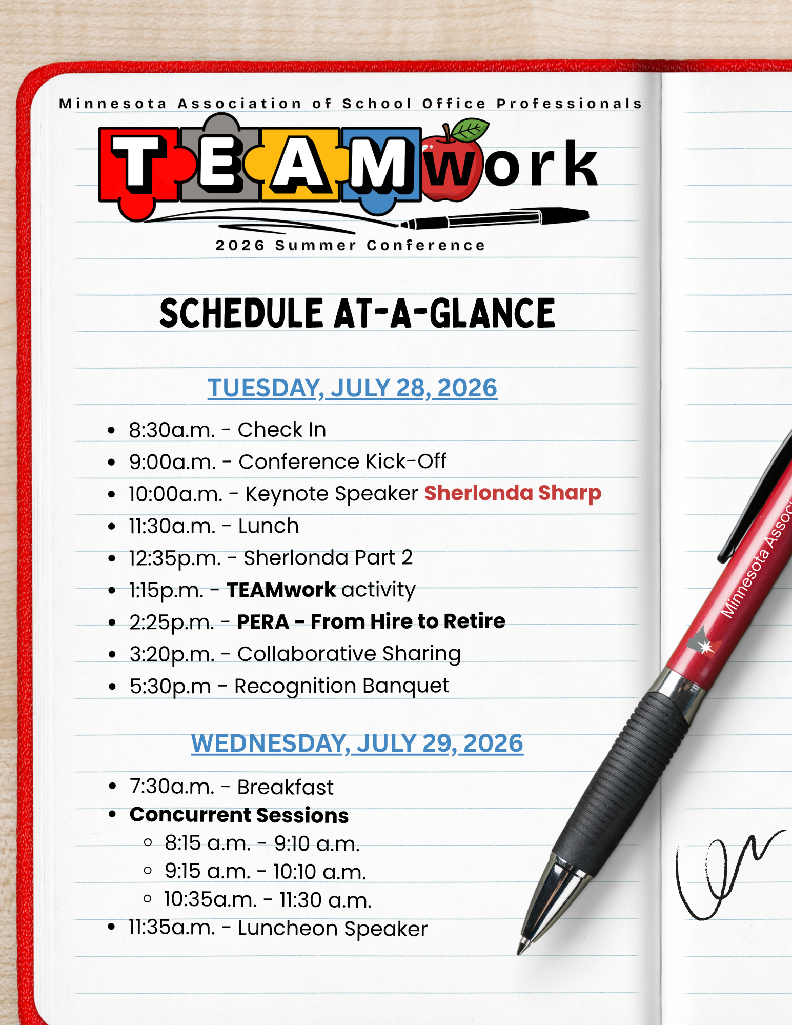 The Minnesota Association of School Office Professionals sponsors a conference each year prior to the start of the school year. School office professionals from across the state gather for two (2) days of learning, laughter and networking.